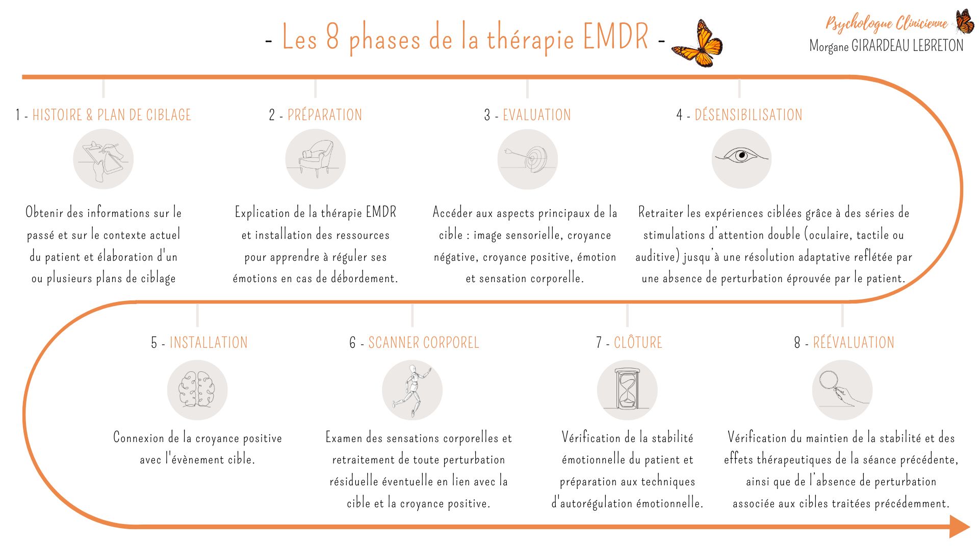 Il s’agit d’une thérapie en 8 phases, dont la durée et le déroulé peut varier d’une personne à l’autre. Tous les protocoles EMDR incorporent les 3 éléments suivants : passé, présent et futur.